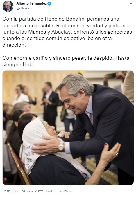 «El presidente de la Nación Alberto Fernández despide con profundo dolor y respeto a Hebe de Bonafini, Madre de Plaza de Mayo y luchadora incansable por los derechos humanos», indicó el jefe de Estado en un comunicado oficial.