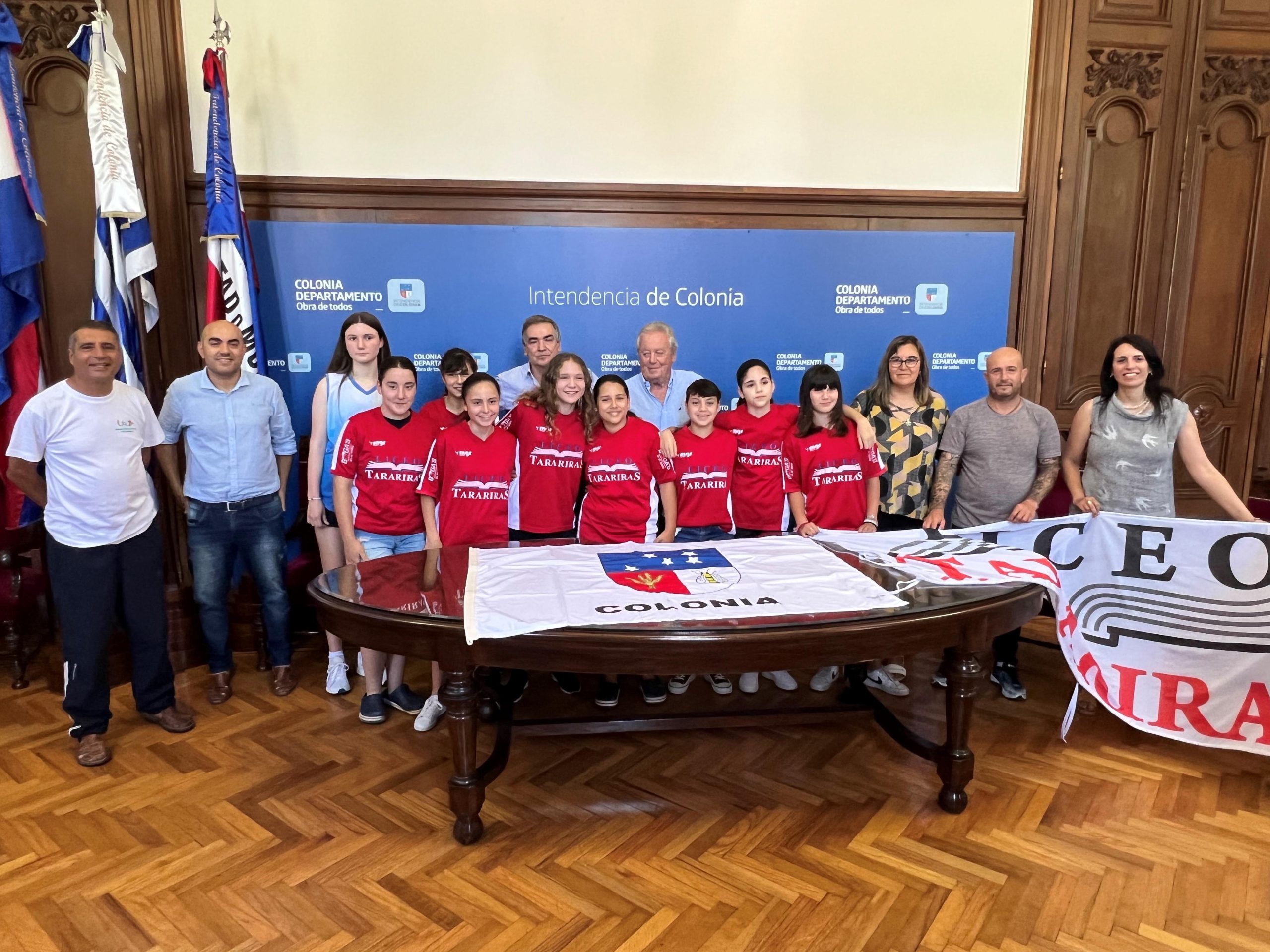 El acto que se desarrolló en la tarde del pasado lunes 5 en el Salón de Actos del Palacio de Gobierno Departamental, contó con la presencia del Intendente Dr. Carlos Moreira Reisch, junto al Secretario General de la Intendencia Guillermo Rodríguez, el Director de Deportes Diego Berretta, la Directora del Liceo de Tarariras Verónica Pino, la Sub Directora Silvana Ávila y los Profesores de Educación Física Dino Perrini, María José Ferrari, Mario Rodríguez y los alumnos liceales tararirenses que participarán en el Equipo de Futsal Femenino: Agustina González, Viviana Delfino, Geraldin Orozco, Angelina Beltrán, María Paula Bica, Selene Bayón, Evangelina Sanguinetti y Haidee Gutiérrez.