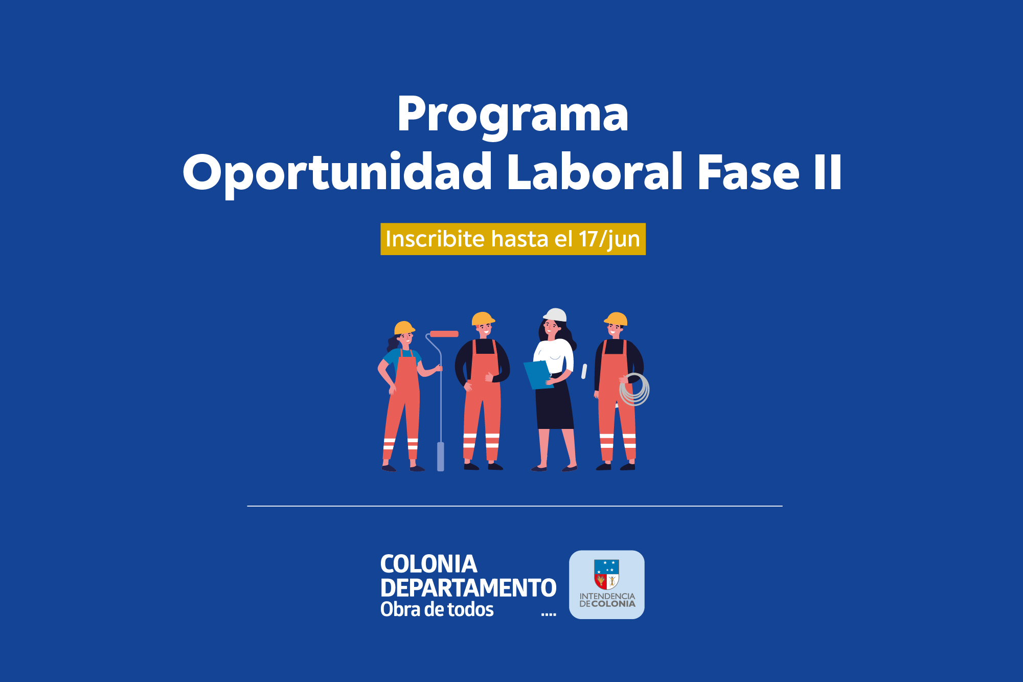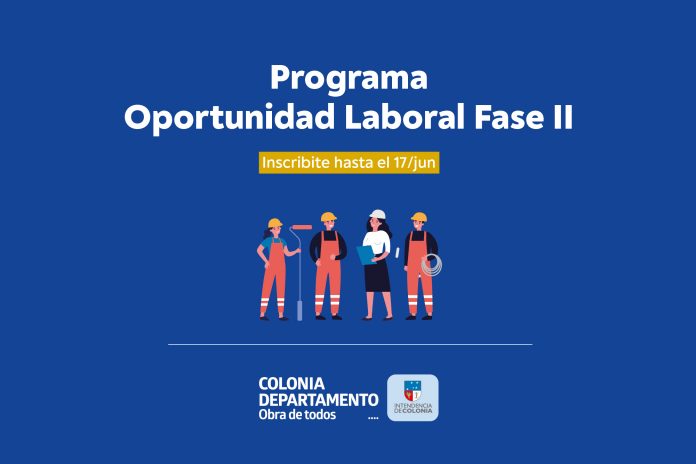 La Intendencia de Colonia comunica que desde el viernes 10 y hasta la hora 12:00 del viernes 17 de junio, está abierta la inscripción para el Programa Oportunidad Laboral Fase II que dará trabajo en el departamento de Colonia a 394 personas.