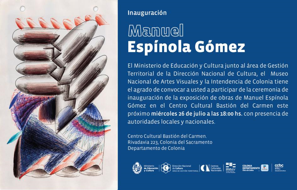 La Intendencia de Colonia a través de la Dirección de Cultura informa que el área de Gestión Territorial de la Dirección Nacional de Cultura, el Museo Nacional de Artes Visuales y la Dirección de Cultura de Rocha inaugurarán el próximo miércoles 26 de julio la exposición itinerante “Manuel Espínola Gómez” en el Centro Cultural Bastión del Carmen (Rivadavia 223, Colonia del Sacramento).
