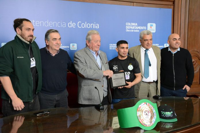 El Intendente de Colonia Carlos Moreira Reisch, junto al Secretario General Guillermo Rodríguez, el Director de Deportes Diego Berretta, el Presidente del Club Plaza Colonia Carlos Neves, el Manager Entrenador Juan Prandi y el Campeón Sudamericano del Consejo Mundial de Boxeo Ruben Darío «Mariachi» Casero, integraron la mesa en el reconocimiento que la Intendencia realizó al campeón.