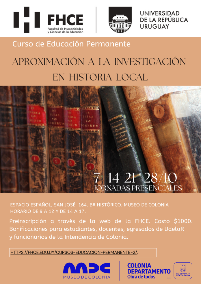 La Facultad de Humanidades y Ciencias de la Educación de la Universidad de la República, tiene el agrado de presentar el curso de Educación Permanente “Aproximación a la Investigación en Historia local”, que se dictará en Colonia del Sacramento con el apoyo de la Dirección de Cultura de la Intendencia de Colonia.